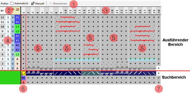 : Für den stricktechnischen Ablauf der Aktionen Umhängen, Abwerfen und Nachkulieren ist der Anwender verantwortlich.