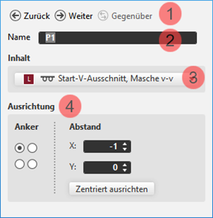 Offset in x-Richtung und y-Richtung für die Platzierung des zugeordneten Strickelements in Bezug zum Markierungspunkt in Abhängigkeit des gesetzten Ankerpunkts | ||