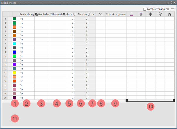 Strickbereiche anklicken. - Das Toolfenster Strickbereiche erscheint.