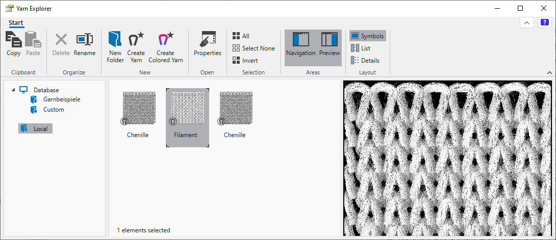 Im Ordner Lokal werden alle Garne angezeigt, die du derzeit im geöffneten Design-Projekt einem Muster zugeordnet hast.