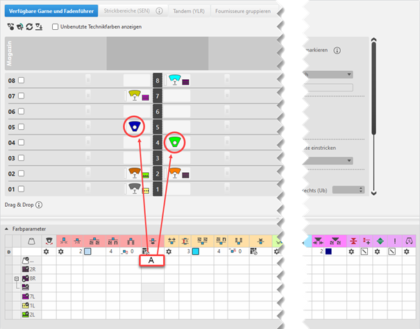 Besteht die Notwendigkeit dem Fadenführer der linken Schulter andere Attribute zuordnen zu müssen, muss eine weitere Garnfarbe oder eine Unterfarbe zur Hauptfarbe in der Tabelle Farbparameter vorhanden sein.