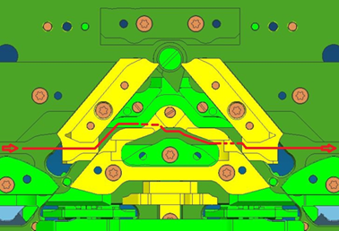 Durch den Systemumbau kann der Schussfaden im Kammspalt verriegelt werden bis eine nachfolgende Maschenreihe gestrickt wurde. - An den Farbfeldrändern bei Intarsia tritt das Problem auf, dass der Faden, der vom Fadenführer ins Farbfeld zurückgeht so hoch liegt, dass er nicht von der ersten Nadel des Farbfeldes erfasst wird.