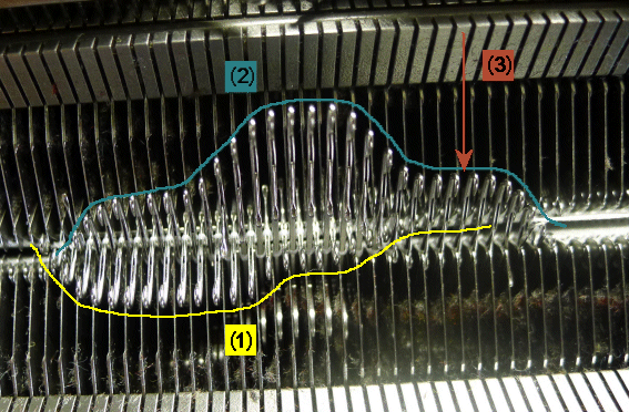 - Neu eingelegte Schussfäden werden nicht sicher unterhalb des Nadelkreuzes (Schnittpunkt Auflageflächen gegenüberliegender Nadeln) gehalten, da sie noch nicht in das Gestrick eingebunden sind.