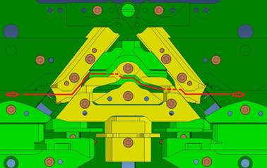 : Ist für 5,2“-Schloss nicht möglich, da aufgrund der Schlossausführung die Tiefhaltenadeln zeitlich nicht vor den strickenden Nadeln ausgetrieben werden können.