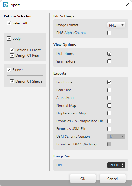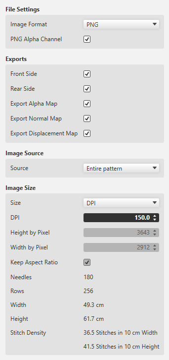 Die Gestrickansicht für die Weiterverarbeitung in einer 3D-Bekleidungssoftware immer als PNG mit aktivierter Transparenz (PNG Alphakanal ) exportieren. -