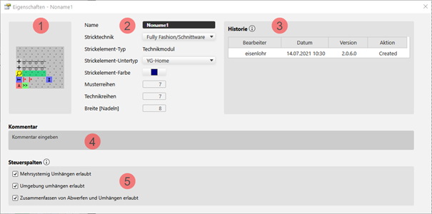 Registerkarte mit allen Attributen zum Erstellen der verschiedenen Strickelement-Typen | ||