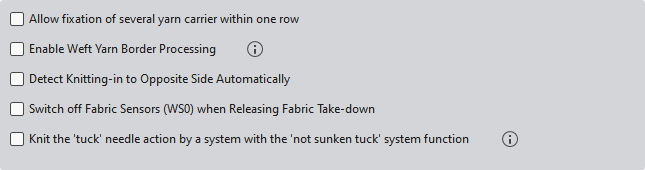 Alle Technikreihen mit der Nadelaktion Fang werden mit einem Stricksystem gestrickt, für das die Option Nicht kulierter Fang gesetzt ist. Für einzelne Reihen aktivieren Sie die Funktion in der Steuerspalte Systemfunktion .