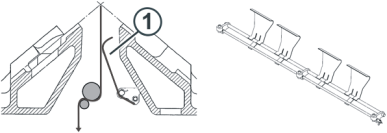 Wenn das Gestrick abgeworfen wird, schwenkt der Warensensor nach unten und stellt die Strickmaschine ab. |