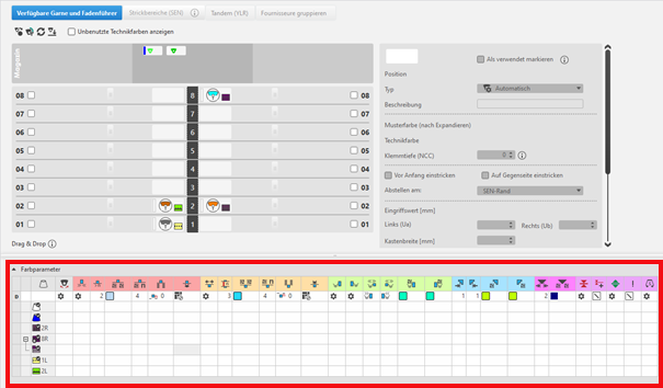Die Fadenführergrundstellung wird bei der Technik-Bearbeitung ermittelt. - Technikfarben (nicht zur Erstellung eines Designmusters verwenden)