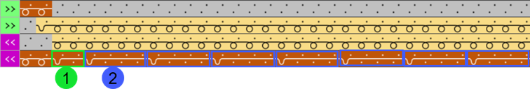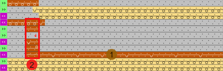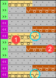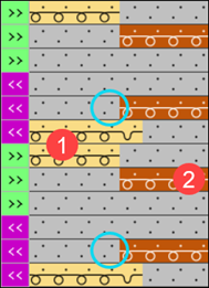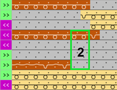 An der linken Kante des Farbfeldes ((2)) wird KEINE Intarsia-Bindung eingetragen. |