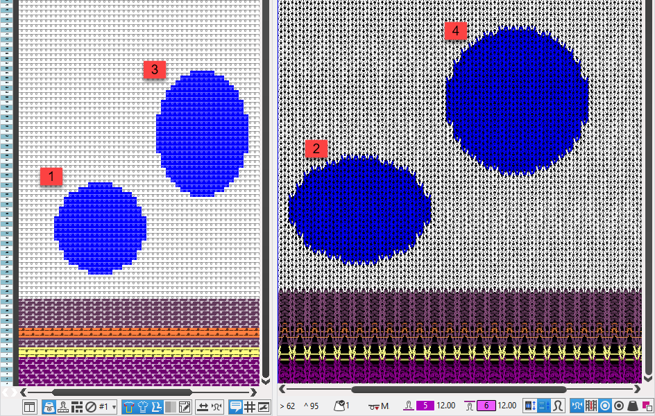 Aus einer Ellipse (3) in der Designansicht, wird ein Kreis (4) in der Gestrickansicht.