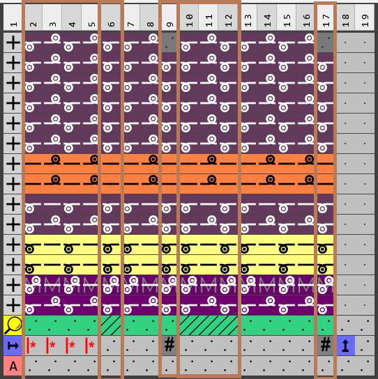 eine Überbreite am Formrand (Spalte 9 und 17). - Ein Startbereich (im Bild nicht vorhanden) würde sich links vom Wiederholungsbereich befinden.