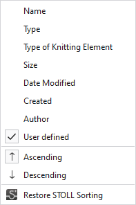 Eigenschaft auswählen, nach der die Strickelemente sortiert werden.
