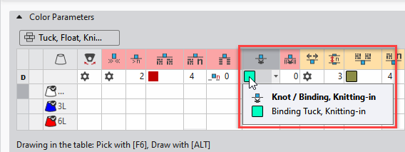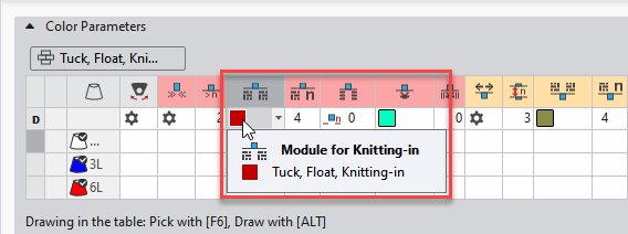 Die Module für Einstricken/Knoten und Ausstricken/Knoten wählen Sie unabhängig voneinander in separaten Spalten der Tabelle Farbparameter aus.