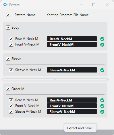 - Neben jedem erfolgreich extrahierten Strickprogramm erscheint ein grüner Haken