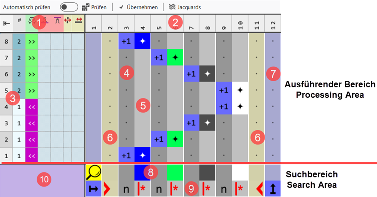 Mit Hilfe eines oder mehreren Color Arrangements kann man in einem Muster bereichsweise oder im gesamten Muster den Strickablauf manuell beeinflussen.