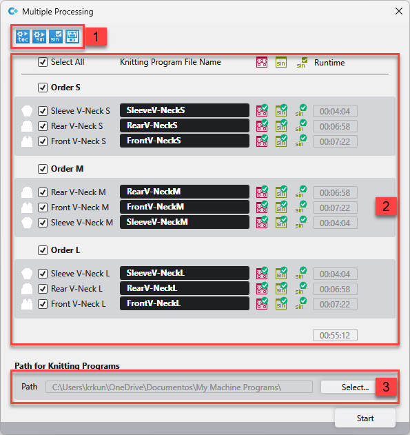 - Die eingestellten Bearbeitungsschritte werden für alle ausgewählten Muster nacheinander durchgeführt.
