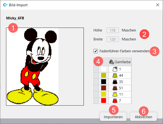 - Gegebenenfalls im Dialog Bild-Import in der Tabelle (4) über das Auswahlmenü die angezeigten Farben ändern.