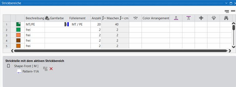 - Im Toolfenster Strickbereiche die gewünschten Strickbereiche anlegen: