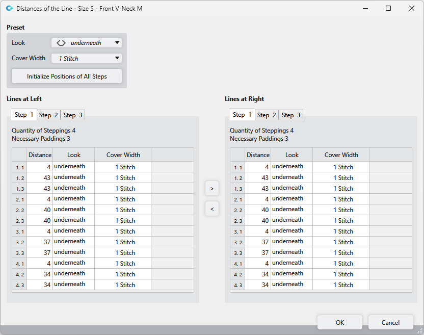 Einstellungen der Abstände und Stufungen für Mehrstufiges Mindern der rechten Linie. |