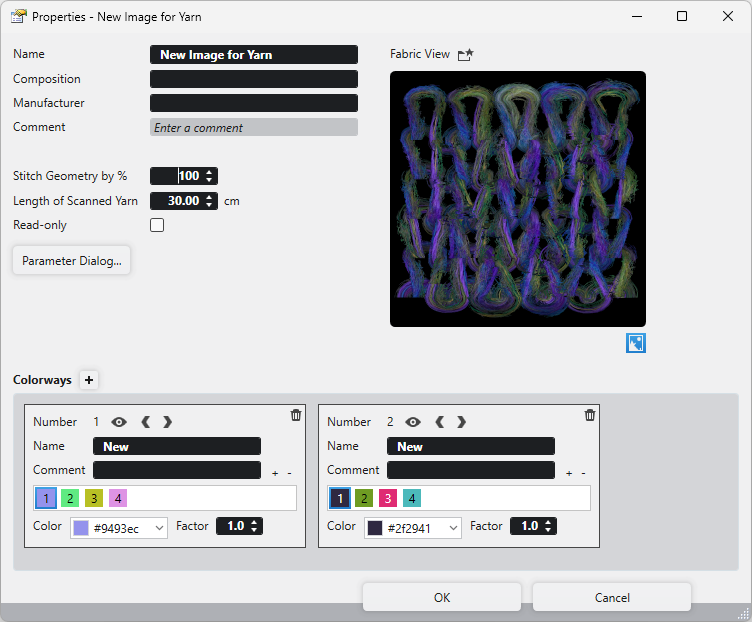Öffnet den Parameter Dialog in dem Sie Einstellungen für das Bild des gescannten Garnes vornehmen. |