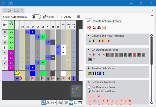 The colors (= yarn carrier) from the 'processing area' of the CA are processed according to the number of knitting systems of the selected machine.