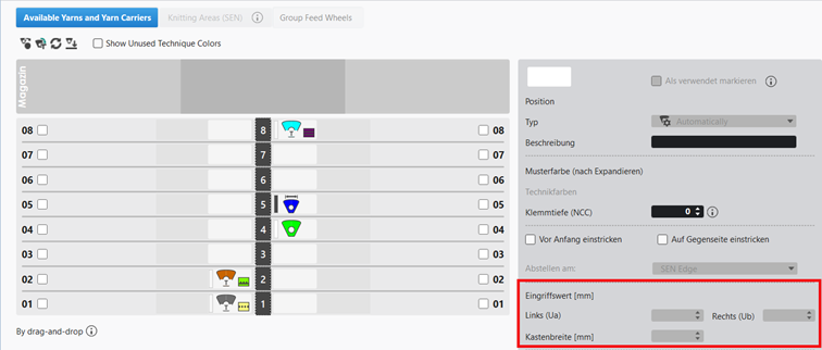 : En la tabla pueden ser entradas hasta 8 entradas (columnas A - H) para el vanisado y / o el tisaje con guiahilos de trama.