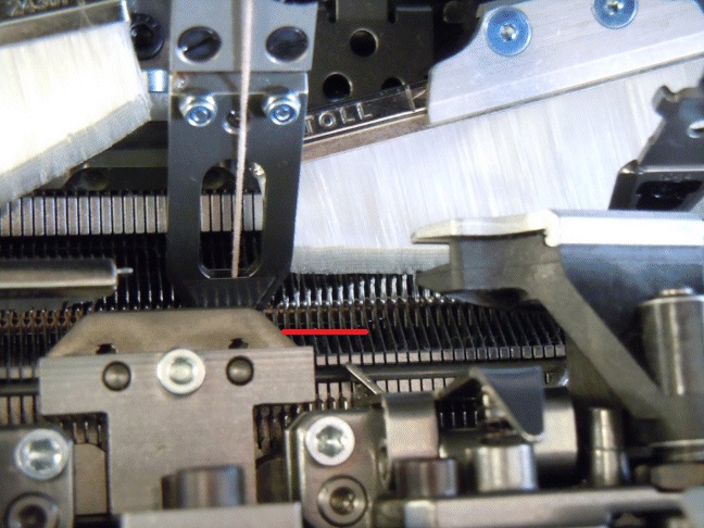Newly inserted weft yarns will not be held securely below the needle crossing (crossing point of the supporting surfaces of opposite needles), as they are not enclosed by the fabric. Raising the needles earlier by the transferring curve allows to "lock" the weft yarn in the needle bed gap until the following stitch row is knitted.
