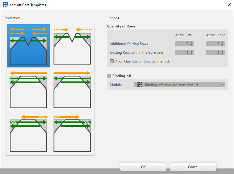 Make the following settings in the Modèles - Tricotage de gousset tool window: