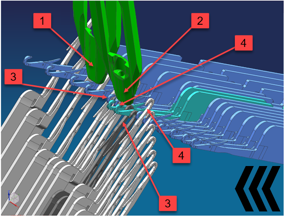 The needles (dark blue and dark grey) are withdrawn between yarn carrier (1) + (2). |