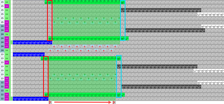 Example: LL structure and 1 color column each at the right and left in the color segment of the yarn color #5 (green) for border processing | |