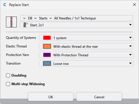 Knit the start with excess width. When the checkbox is active, the start is knitted with excess width and afterwards it is narrowed to the pattern width with multi-step narrowing. |