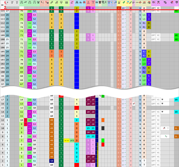 Nascondi colonne di comando (TAB) - Le colonne di comando sono suddivise in gruppi contrassegnati a colore.
