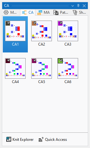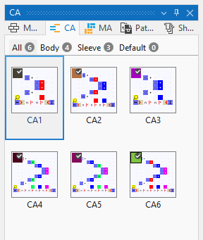 With an active filter, the pattern names of the project appear above the CAs. Beside each name appears the quantity of CAs that are contained in the pattern. By clicking on the pattern name only the CAs applied in the pattern are displayed. By clicking on Tutti all CAs of the project are displayed.