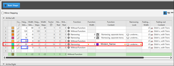 Allocate the generated narrowing module to shape lines no. 6 of the left and right shape part.