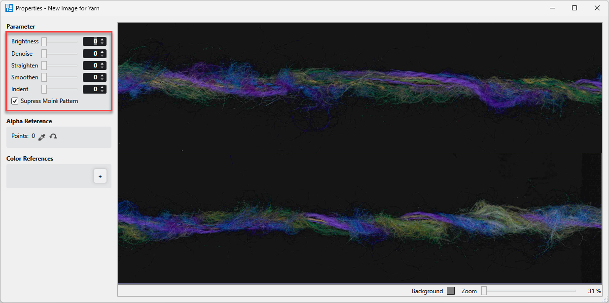 In the Parameter dialog box you make the following settings for the image of the scanned yarn: