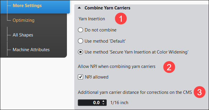 - If necessary, make the desired presets for combining yarn carriers in the Outras configurações tab of the Configuração dialog box.