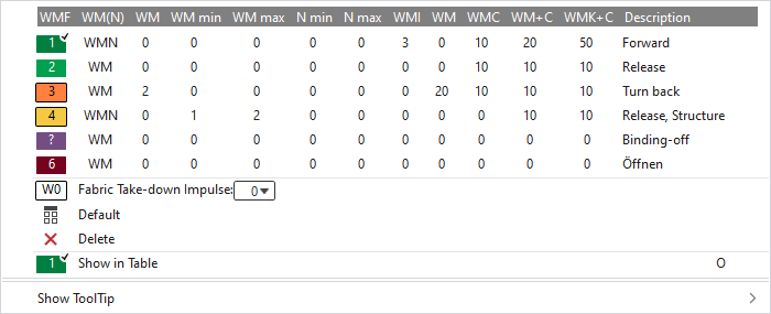 Opens the displayed entry of the main take-down table in the Setup data. There you can make further settings and then apply them to the pattern. |