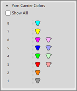 : Yarn carriers are automatically placed on the yarn carrier rails due to STOLL default settings and are taken into account during the determination of the yarn carrier home position during the 工艺处理. - 导纱器颜色