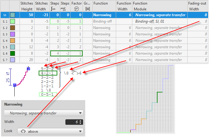 - El aspecto de menguado sobrepuesto o infrapuesto aparece a través de los símbolos <_> y < > antes de la anchura de menguado