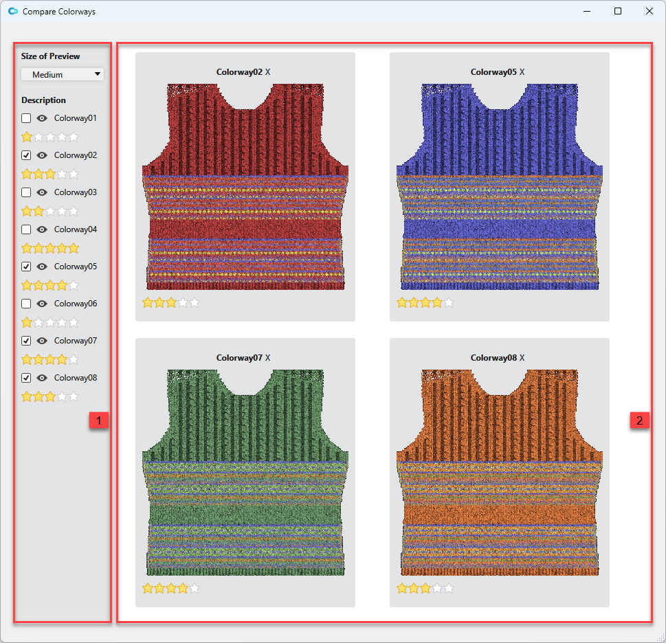 You can compare the presentations of different colorways from the Combinaisons des couleurs table to each other in the Comparer les positions de couleurs tool window..