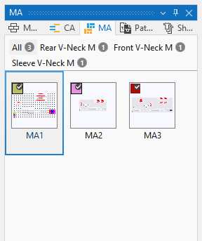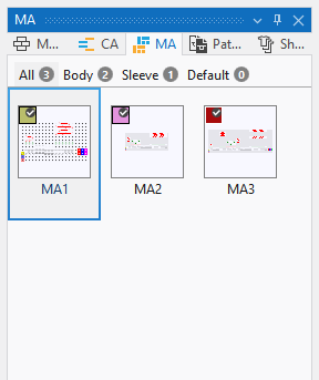 With an active filter, the pattern names of the project appear above the MAs. Beside each name appears the quantity of MAs that are contained in the pattern. By clicking on the pattern name only the MAs applied in the pattern are displayed. By clicking on Tous all MAs of the project are displayed.