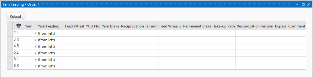 The inserted yarn carriers will be displayed. Sort by this column in order to get an overview of all yarn feedings. | |