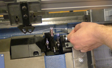 - Position the yarn carriers next to the corresponding collecting clamp unit on the right or on the left according to the yarn carrier home position.