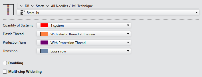 Lavorare l'inizio più stretto. Con casella di controllo attiva, l'inizio viene lavorato più stretto e allargato successivamente con aumento a parecchi stadi sulla larghezza del disegno. |