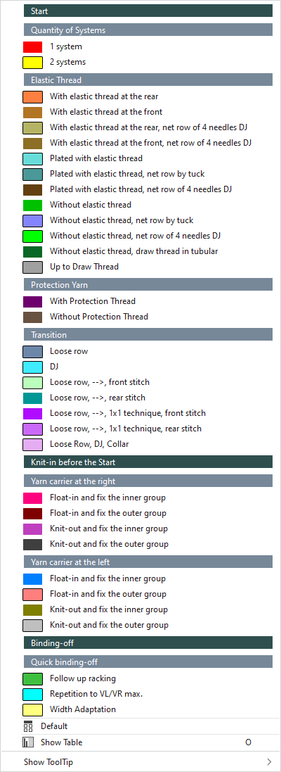 With Float and Lock modules the entries determine the yarn carrier groups that can be used in these areas. |