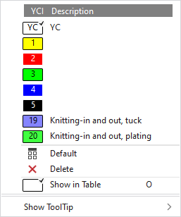 Opens the yarn carrier correction table in the Parametri del disegno . There you can select further entries and make settings. |