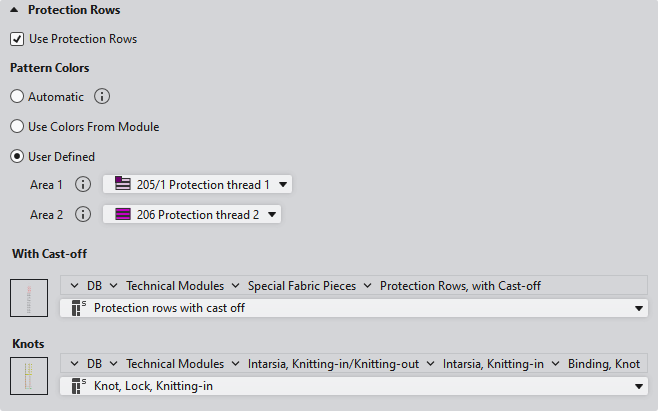 Colore del filato in ranghi di protezione: Predefinito i per la zona a destra dell'apertura This setting is only used in one area. If the selection is set to automatic, the basic color or the color of the last pattern row is applied. |