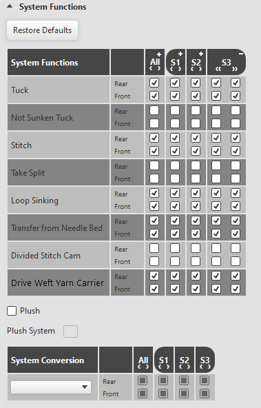 Set the different available functions for every knitting system on every needle bed.