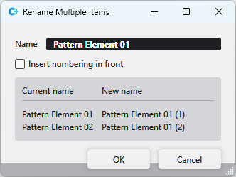 The current and the new names of the knitting elements are shown in the lower part of the dialog box. |